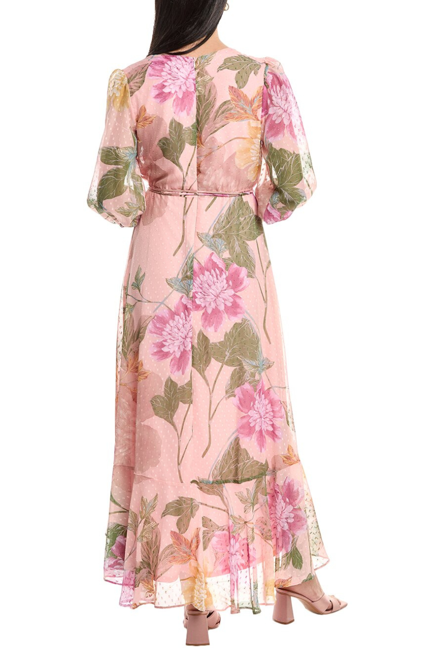Chiffon maxi with floral prints, ruffle trim and elasticized cuffs, closes with a zipper at the back.