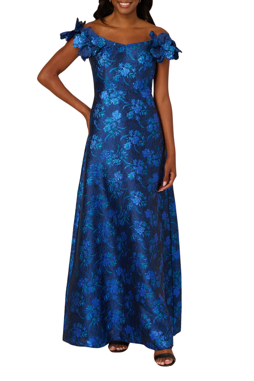 Designed in a rich floral jacquard with a subtle sheen, this evening gown brings modern romance to any formal occasion.