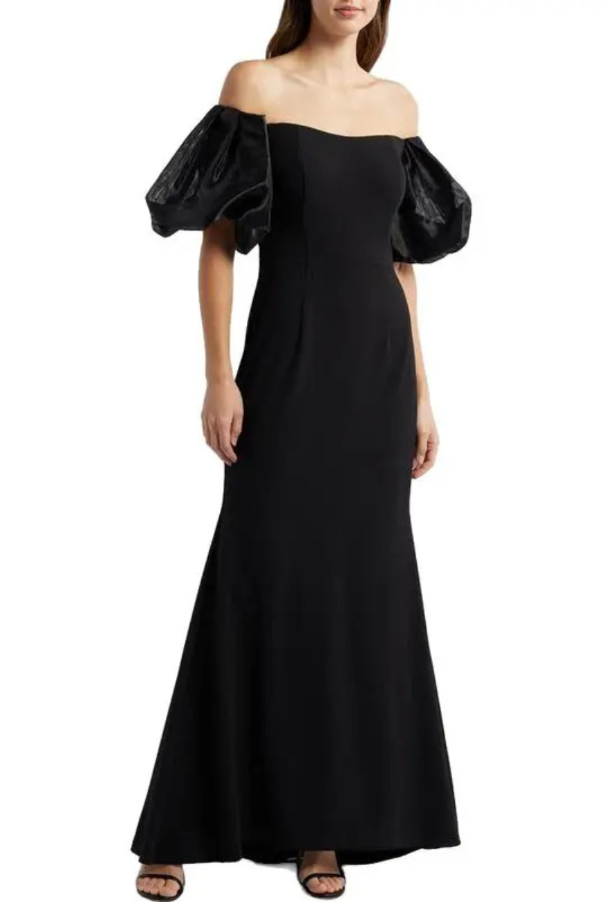 Mermaid gown with organza sleeves and off the shoulder neckline
